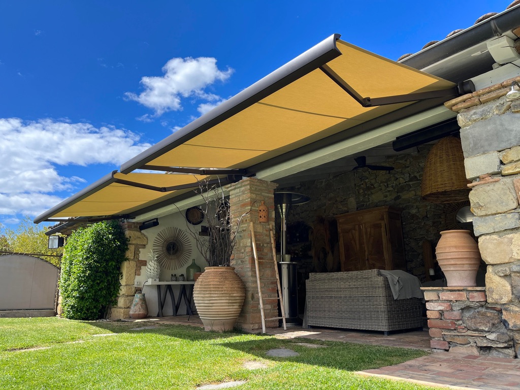 Toile acrylique haut de gamme 300g/m2, teintée dans la masse. Testez dans notre onglet DESIGN SELECTOR : Choisissez votre toile préféré et visualisez-la sur une installation.